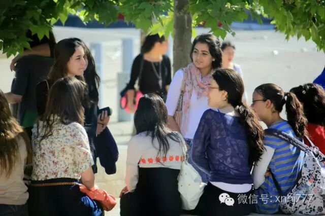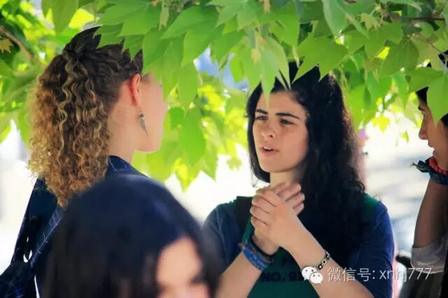 耶路撒冷,犹太大屠杀纪念馆:绿荫下,两位女学生交谈着,正对镜头的那一位颇有电影明星的气质。