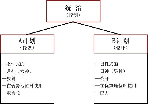 撒旦用两种方法来实现控制:第一种,是女性式的,通过表现出弱势——若女人试图操纵丈夫,通常用眼泪、受伤的感觉等;第二种,是男性式的,暴力恐吓。归结起来,A计划,月神/亚舍拉(Asherah)的女性方式;B计划,太阳神/巴力(Baal)的男性方式,两个计划都殊途同归,走向撒旦的控制。