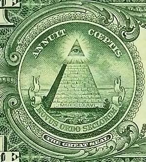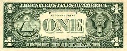 上图的一美元的钞票,是世界最有名的通货之一,票面上挤满了共济会符号。所看到的两个圆圈里,都有怪异的图像。若持续阅读之前的系列的文章,那么我无需再冗繁解释。