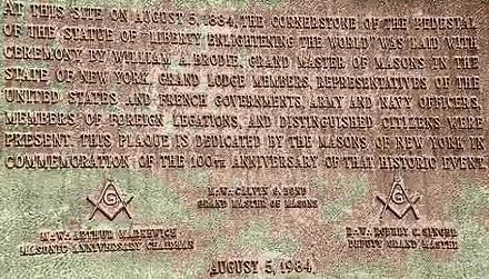自由女神像在共济会仪式里奠基,其底座有一个纽约共济会特别制作的牌匾。