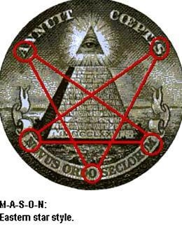 巧合的是,倒转的五角星拼写“MASON”这个单词,也就是“共济会”的意思,可通过将一些单词的首字母或尾字母串联一起得出。钞票里也存在13的倍数,例如,金字塔有13层。在此我也只是猜测,但不少人相信今日世界存在13个光明会的家族,他们正为顶石(capstone)——路西法/敌基督的到来铺就道路和基石。