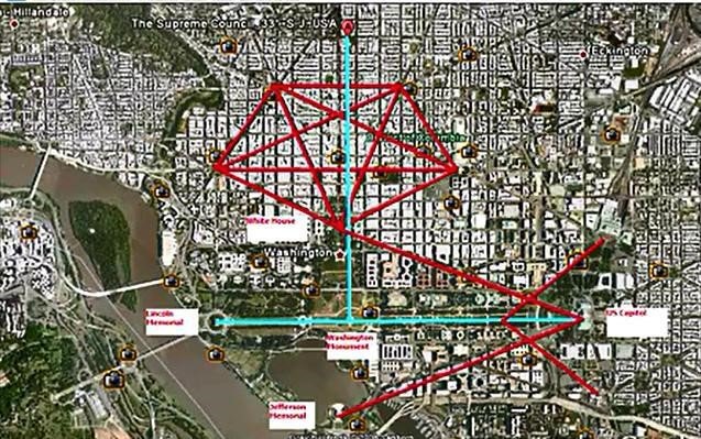 在美国国会大厦、林肯纪念堂、共济会圣殿间画线,将得到一个三角形/金字塔的图形,共济会圣殿在图形顶部——这也是全视之眼所在的地方——又一次代表了共济会的力量。