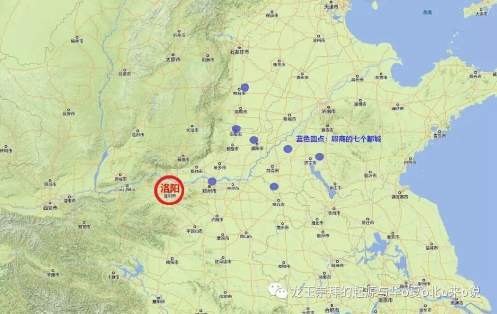 洛邑(故址在今洛阳市西郊),乃至后世的洛阳,位于豫西山地之中的一个盆地之内。这个地方叫做“洛阳盆地”,四面环山,仅有内部很小的一点平地。从地理大形势上看,洛邑位于平原与山地的分界线上。洛阳以西,基本上是莽莽群山,仅以黄河谷地为通道,与另一块被山地封闭的狭窄平原——关中平原(号称“八百里秦川”)相联系。而洛阳以东,则是肥沃宽广、平坦无际的华北大平原——当时人口和文化的繁盛之地。殷商的七个都城(图中蓝色圆点所示)都位于这个区域之内,那里才是当时已知的“天下”的中心地带。