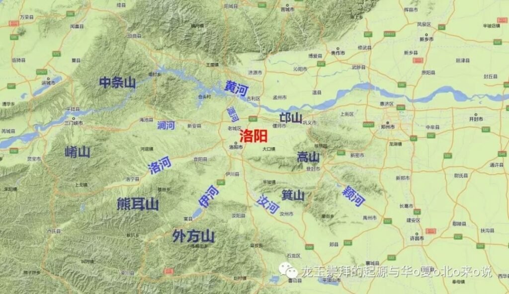 但洛阳盆地这个地方汇聚了二里头遗址、偃师商城、周洛邑王城、汉魏隋唐洛阳城等等众多古代都城,还是有其原因的。只是这个原因与它是否地理中心无关,而是在于其独特的山川形势。我们来把地图放大,看看洛阳附近的地形。