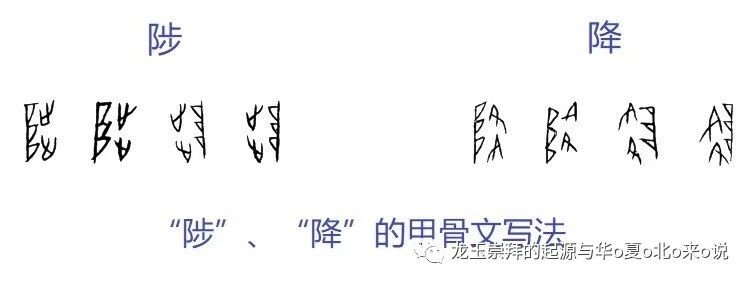 这两个字的基本部件完全一样,都包括两只“脚丫子”的象形(“止”的初文)和一个阶梯状的东西。只是“陟”字的脚丫子向上,“降”字的脚丫子向下,表示不同的行进方向。