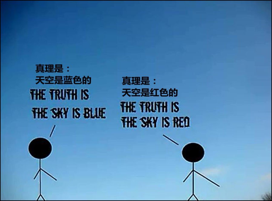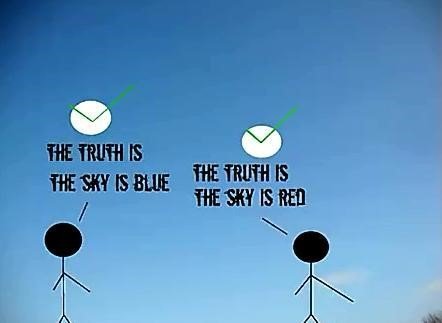 相对主义常常以如下陈述来自我表达:“对你是正确的,但对我却不是。”不再有正确或错误,你相信你的,我相信我的,我们都正确。如果我说天空是蓝色,其他人说是红色,那么我们都是对的。天空对你来说是蓝色,但这只是我的真理,如果对其他人来说,天空是红色,那是他们的真理。