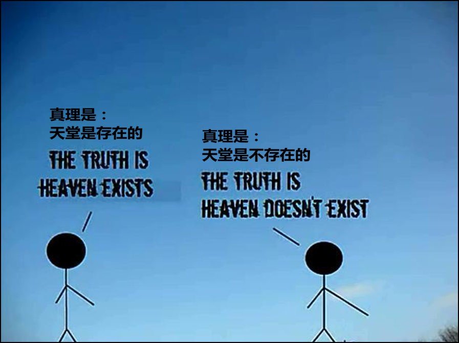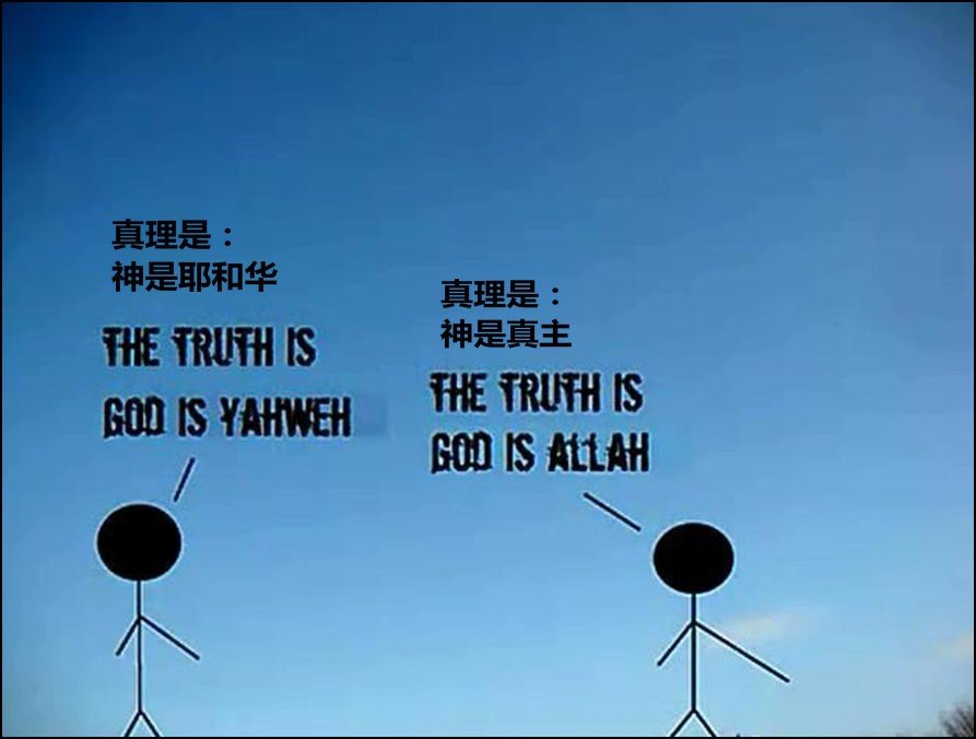 对天空颜色的不同看法并没有什么大不了,但当涉及到关于上帝、道德、天堂、地狱和永恒的主题时,性质就很严重了。因人类把整个儿生命、世界观、文明都建立在这上面。人们乐意为他们心目中的绝对真理而战斗,甚至付出生命。人所相信的,会引导他们的所想、所说、所行,并形成了国家法律的基础。