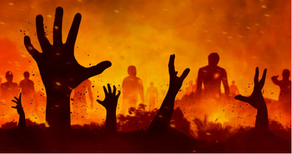 就像磁铁被吸引到金属上一样,所有的人开始慢慢地向这个超自然的存在移动。突然,面纱被掀开了,比尔开始看到这些人一头栽进一个非常大的洞口,他把这个洞口描述为“一个巨大的坑”。就在那时,他注意到另一种天使模样的生物把人们投进了这个位于地下某处的不可估量的洞口。当比尔被拉到峡谷边缘时,他估计这个裂口的周长有好几英里。他能看到较低的地方,那里巨大的峡谷里有成千上万个小坑,全都被大火烧着了。他的耳朵被震开了,突然听到下面传来一阵巨大的呻吟声和哭声,就像数百万人的灵魂从一个大体育场里呼喊一样。声音是那么大,那么多样,有男有女。他注意到每个小坑里至少有两个人。在某些情况下,一个人会把手伸进火里,拉出一个人,然后对着那个人大声尖叫。还有一些年纪较大的青少年因为父母在场而责备他们。比尔听到一声尖叫,“都是你的错!”