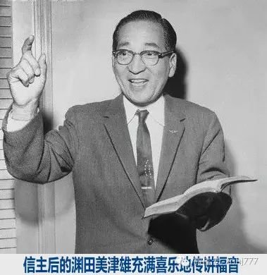正在沉思以上的事的时候,一天在东京的火车站里,看见赠送新约全书的人在讲道。我停步接受一张福音单,乃雅各·德沙哲(Jacob Deshazer)博士的见证:“我是日本的俘虏,在日本被囚了3年多。”我一见便发生兴趣,立刻把它读完。其中一段使我感兴趣的,是作者在集中营的时候,有一天忽然要读圣经,因为他听过人说基督能化仇恨的心产生亲爱的心,于是我也找到一本圣经,下手研究。我才读了30余页,我的人生顿然改观,我对于世界,已有另外的眼光。