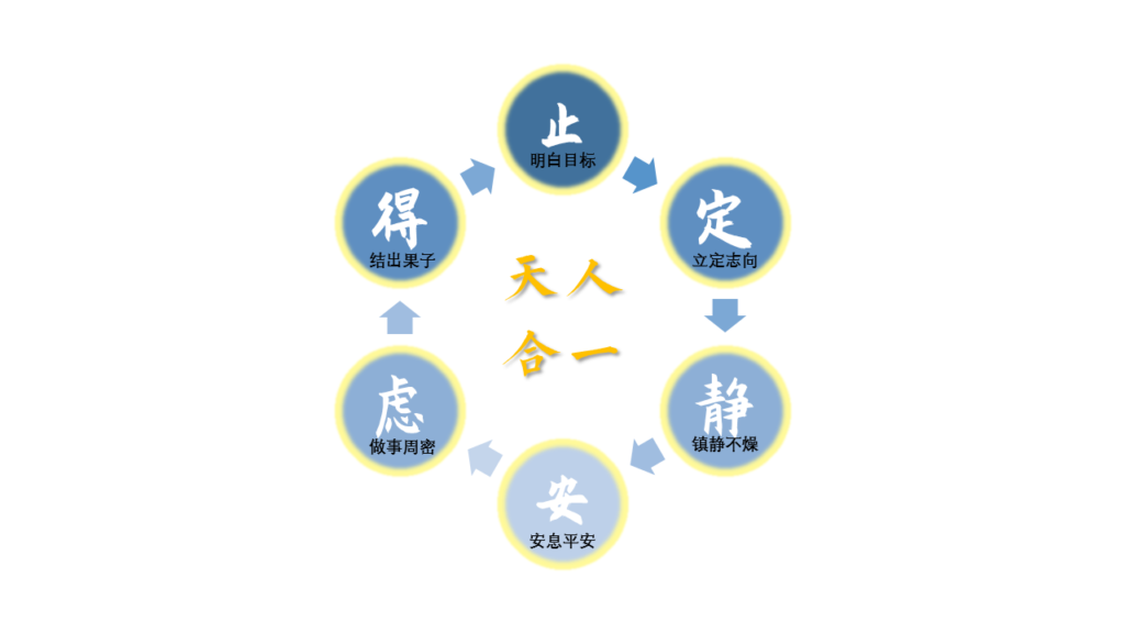 成功的六个步骤:止、定、静、安、虑、得,与“精明”的要素很像,甚至互有补充,“止”就是领悟和明白至高者的旨意和命定,“定”就是立定志向,跟从这旨意和命定,“静”与“安”关系到我们的安息,安息中才能真正跟随至高者,“虑”就是周密的思考,谨慎地做事,“得”自然就是兴盛和成功!