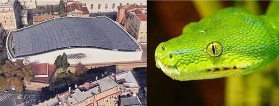 这座大厅由教皇保罗六世命名,由意大利建筑师Pier Luigi Nervi于1971年建成,有6300个座位,内有一座名为“复活”(La Resurrezione)的青铜雕像,由Pericle Fazzini所设计。上面是这座建筑的外观图,看上去没什么,但是如果你把它与蛇的头对比一下的话,就会发现一些让人震惊的东西。