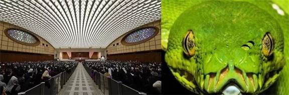 异教和异端崇拜古蛇并不奇怪,但如果这样的东西出现在自称教会的地方的地方,就让人非常奇怪了。而且,这种古蛇崇拜以一种很隐秘的方式出现,完全融入到建筑设计里,这就是天主教会的“保罗六世”观众(音乐)厅。