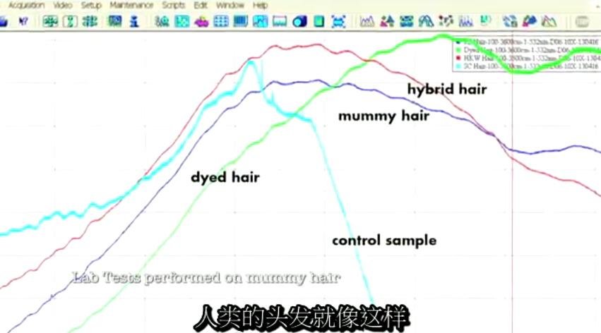 L.A.: 关于头骨, 这里的许多头骨上的头发都是红色的,微红/赤褐色的颜色,其实本不该是这样的。根据达尔文的理论,这些人种应该有黑色的头发,因为他们在1万、1.2万、2万年前穿越白令海峡,但他们的头发是红色的。我们就想检验下,头发有没有被漂染过,因此我们拿了一些样本,有种拉曼光谱仪器(Raman Spectroscopy)可以检测出头发的分子结构(molecular structure),所以我们使用正常人类的头发作为控制样本,从尼非订的头取下红头发取染过的头发,再从一位声称被外星人绑架人那取得生下来的混种人的头发。这样我们有了4个样本,图像上是一份控制样本,人类的头发就像这样,被染色的头发像这样,到了顶上。而接下来,才真正有趣,我的想法是古代遗物(antiquity,尼非订),与今日发生的(外星人绑架产混种人)相关联。在诺亚时代,堕落天使出现在世界上,红色头发与混种人的头发,其图线是这样的,同样的走线,一直到右边的终点,下落。现在记住,这些头发是2500年前的。