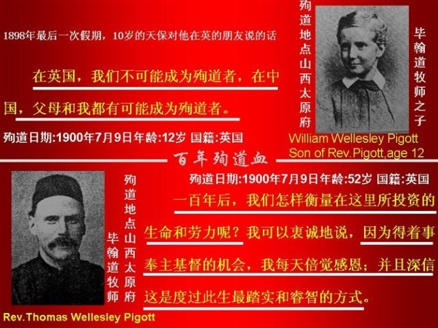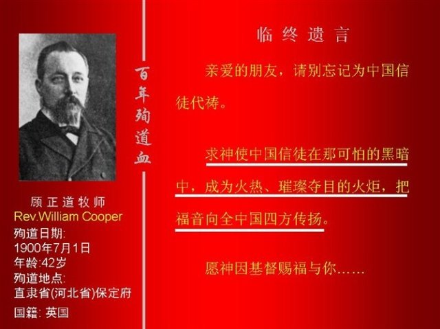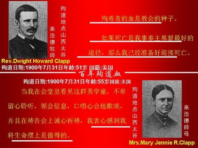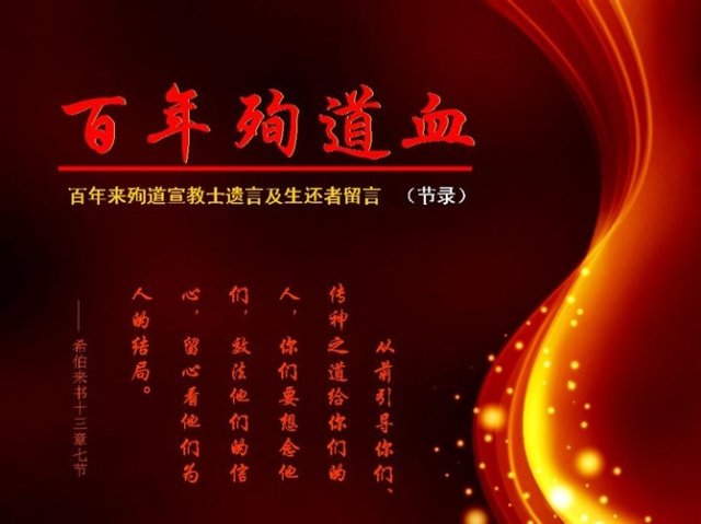 博主按: 这是一本书《回首百年殉道血》中的节录,有位弟兄还把书中殉道的宣教士的语录制成图片,读来真是震撼人心,感谢神,我们今天中国基督教的复兴正是殉道者的血浇灌出来的,他们代表这耶稣基督的爱,也愿神赐给中国教会不怕牺牲的心志,将福音传向万邦,将神的爱给出去!