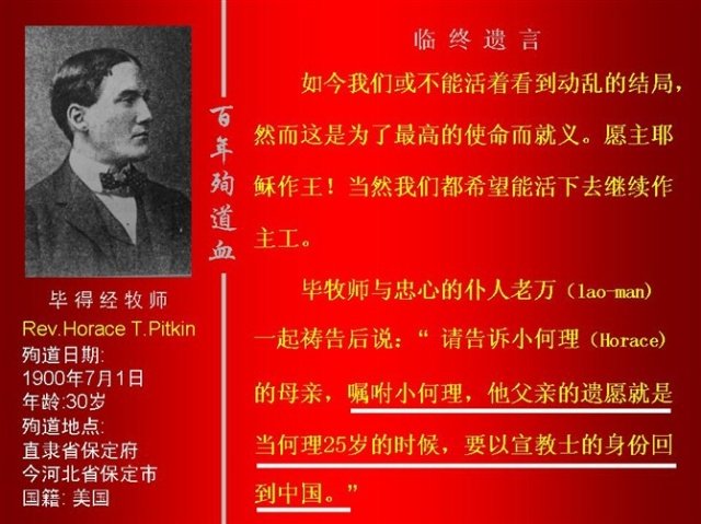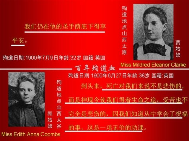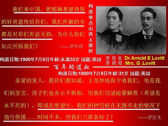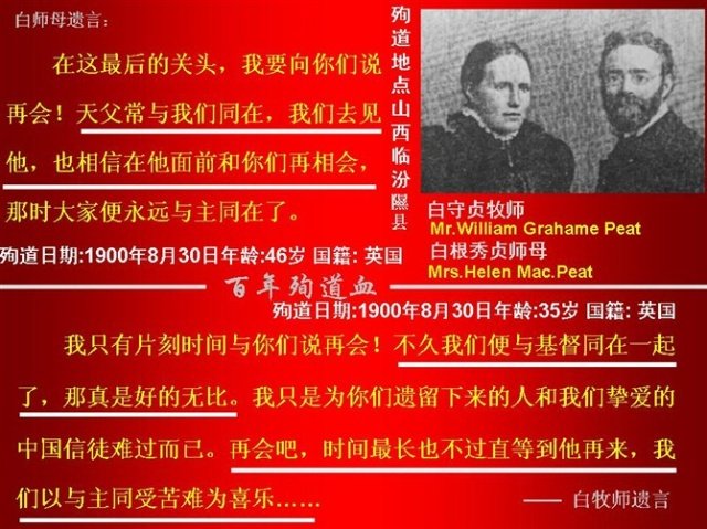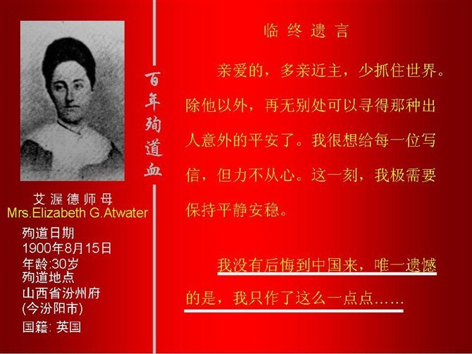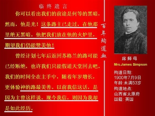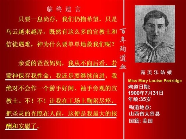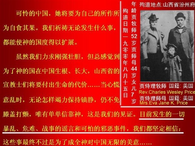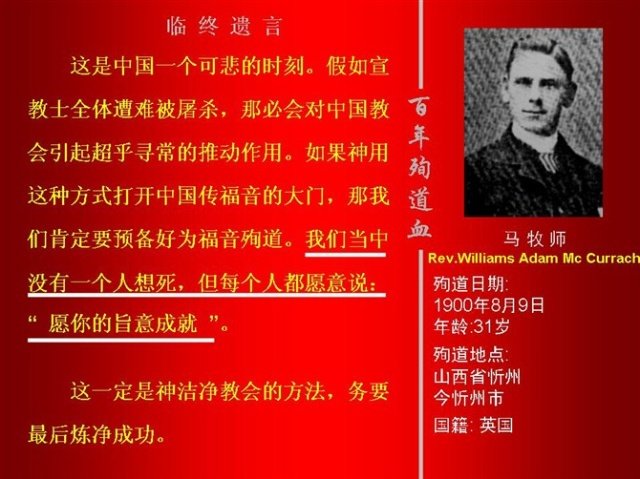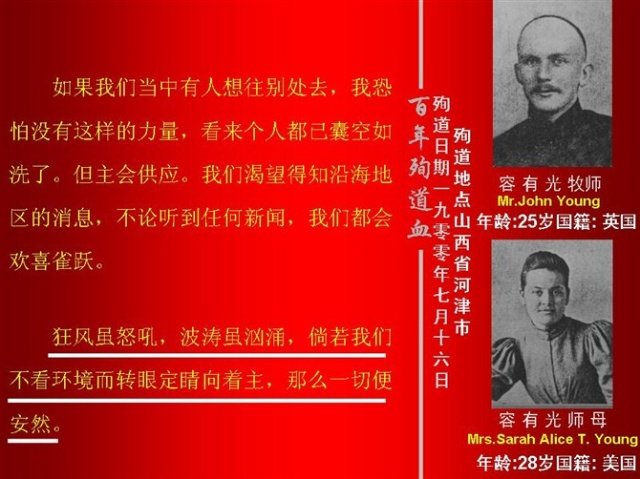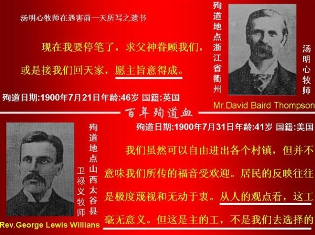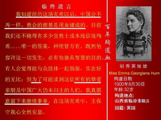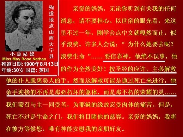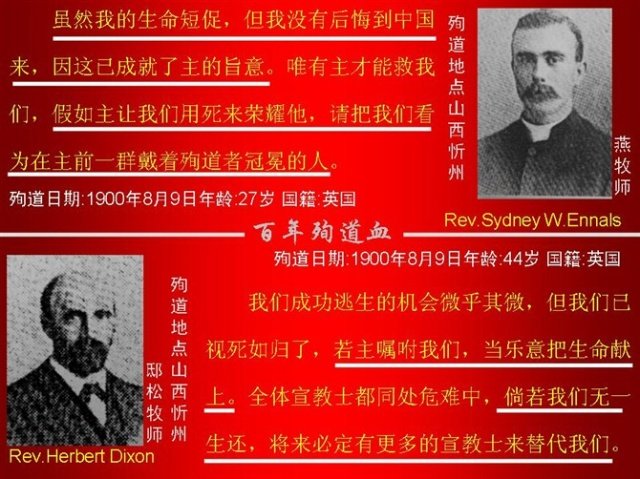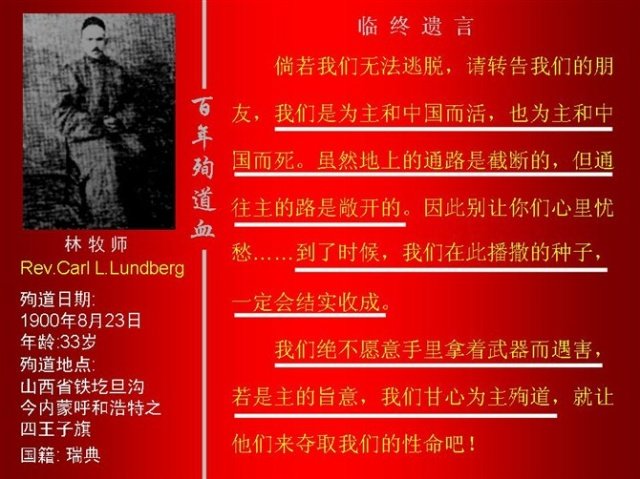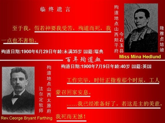 值得一提的是,有瑞典裔美国宣教士留下遗书,其中有这样的话:“如今,通往沿海的路已经截断。倘若我们葬身此地,请转告朋友们,我们是为主耶稣和中国而活,也是为主和中国而死。”