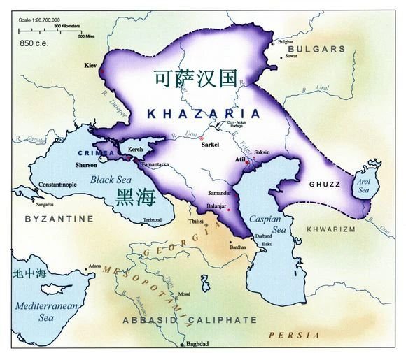 这个民族后来跟随了西突厥,渐渐被突厥化(今天的土耳其人就是突厥民族的代表),所以也被称为可萨突厥,这个民族在跟随西突厥的时候,与中国古代的唐朝也打过仗。可萨汗国全盛以后控制了很大一片土地(如下图所示),包括现今格鲁吉亚、达吉斯坦、俄罗斯的一部分、东乌克兰、阿塞拜疆等,是当时最大的突厥汗国。