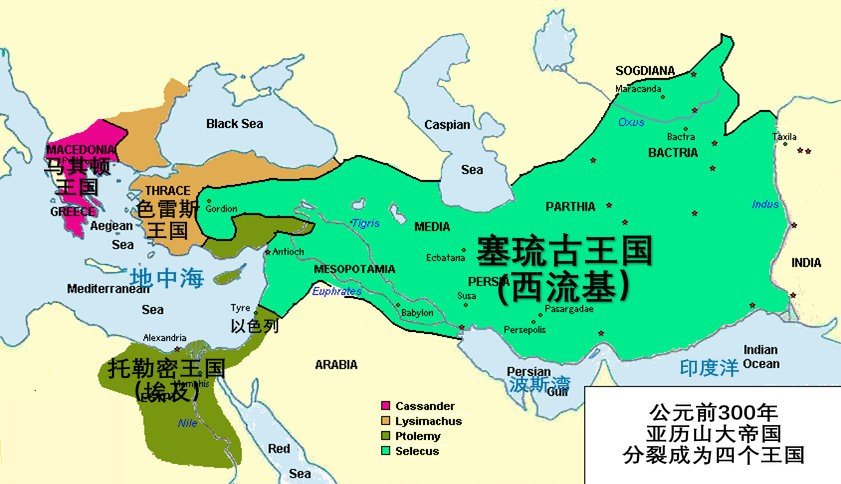 先知但以理曾经预言,代替玛代-波斯帝国的,将是一位“勇敢的王”,他要“执掌大权,随意而行”,这就是从现在希腊兴起的亚历山大大帝,从公元前334年起,在短短十几年时间里,他不仅灭亡了强大的波斯帝国,还四面出击,建立了一个超大的希腊帝国,并将希腊文化带到帝国的各个角落。虽然这个帝国只存在了十几年,但对欧洲中东的文化影响极大,新约圣经就是用希腊语写成。 亚历山大大帝对犹太人还不错,据说他攻占耶路撒冷的时候,有人曾把圣经预言里有关他的部分指给他看,使他对上帝和以色列肃然起敬,因此他保持了波斯帝国时期对犹太人的宽松政策。在他死后,这个庞大的帝国被部下分裂成了四个部分,其中的两个,托勒密王朝和西流基(或者塞琉古,其中心所在地就是当今的叙利亚)王朝先后统治以色列,他们对于犹太人,就没有那么客气了。