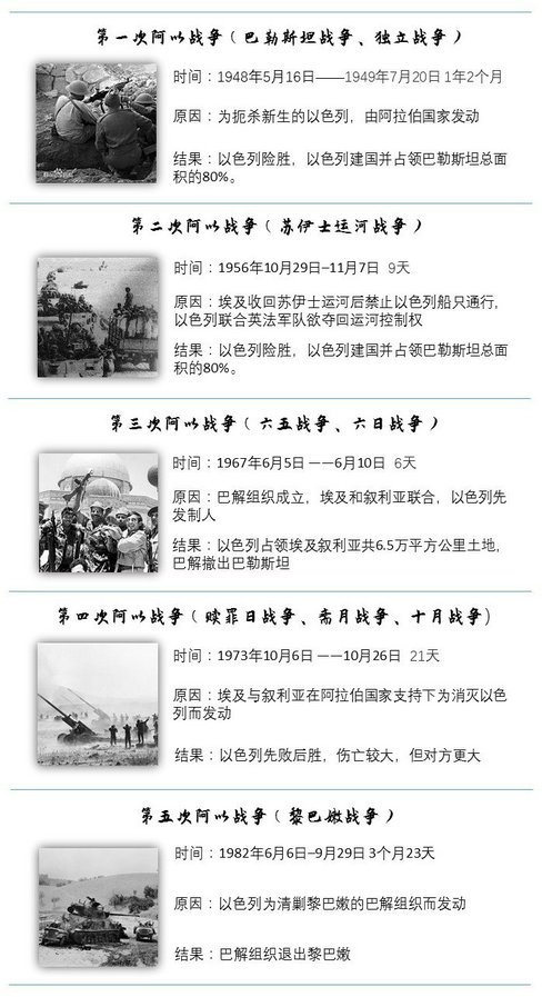 于是,在阿拉伯国家和以色列之间,来来回回又发生了四次中东战争。这里吐槽一下,我们常用的 “中东战争”这个名称不太科学,因为在中东,除了这两方以外,还会发生其它战争,所以国外普遍叫“阿以战争”,我们也采用这个说法,这五次“阿以战争”的概况如下图所示。