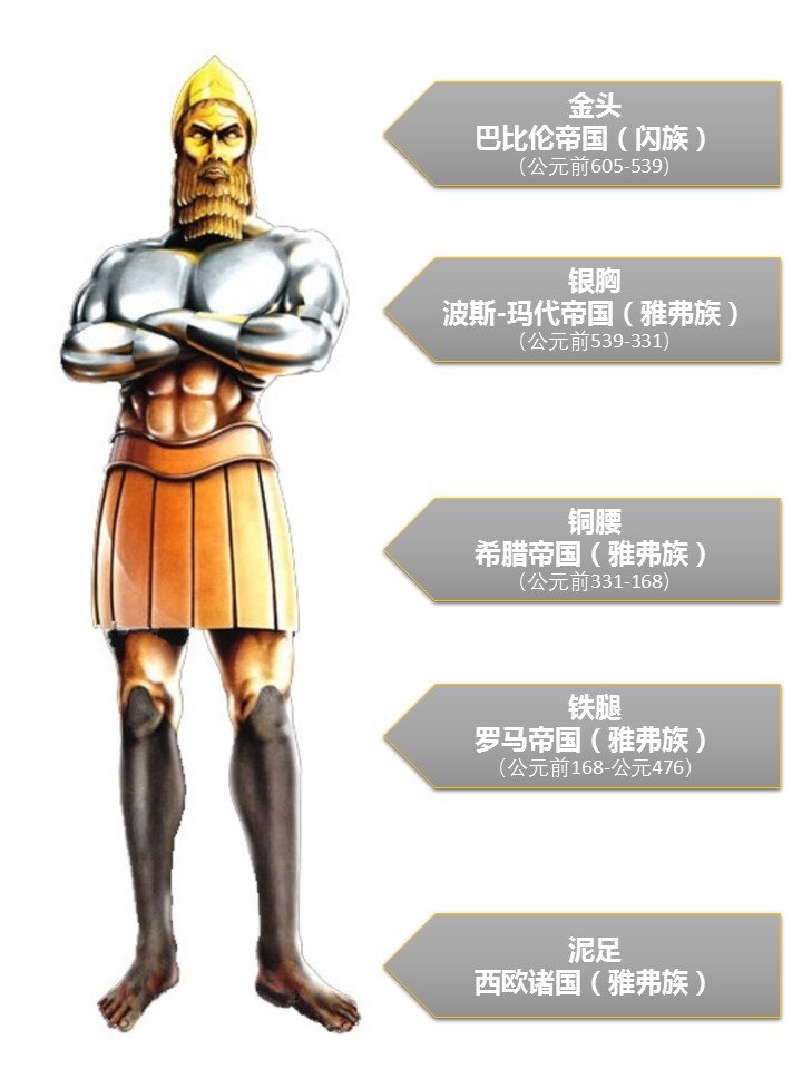 《但以理书》第二章提到的,组成那个巨型雕像的四大帝国,包括巴比伦帝国、波斯-玛代帝国、亚历山大帝国以及最后的罗马帝国(应该也指最后的敌基督帝国),前一个是闪族建立的,后三个均由雅弗族建立,这些帝国统治了欧亚大陆的很大部分,都是旧约时代的最为庞大的帝国。到了新约时代,闪族建立的阿拉伯帝国也曾一时无两,接手阿拉伯帝国(后续还有土耳其奥斯曼帝国)相继为欧洲、英国和美国,这些雅弗族建立的殖民帝国是有史以来最为庞大的帝国。世界历史的主流,就是闪族和雅弗族的彼此斗争,轮流坐庄。