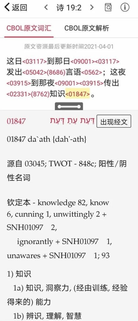 那么,什么是知识?我们可以回到希伯来语和希腊语的原文去寻找其真实含义。查阅原文,沿着“知识”的原文的编号01847,我们会找到如下结果: