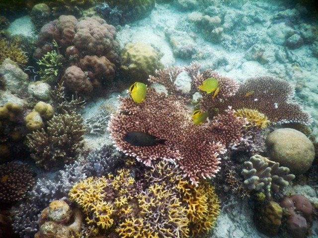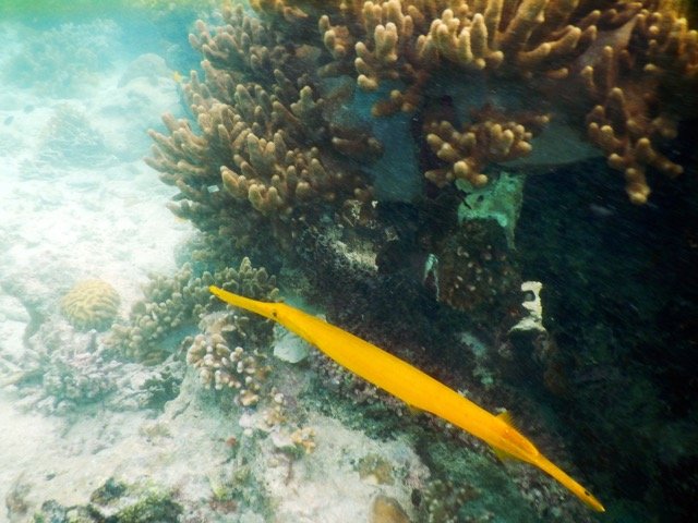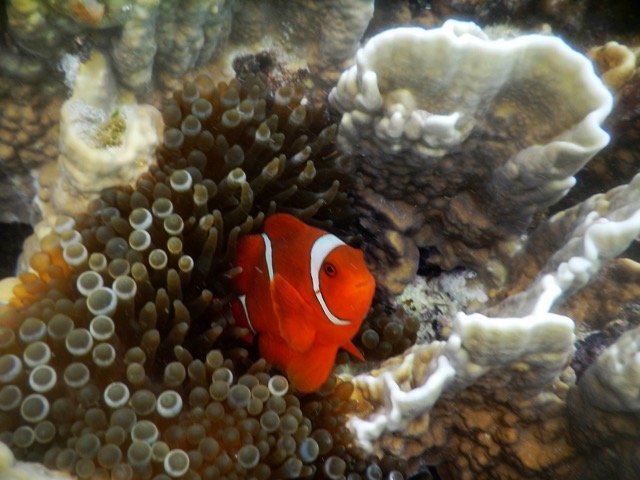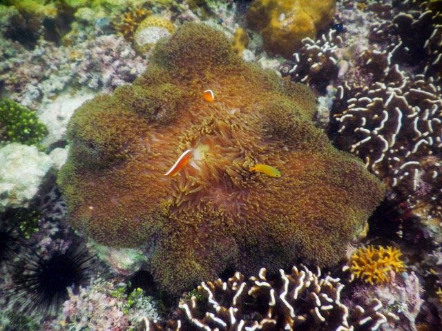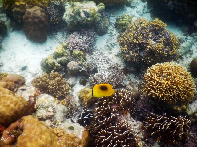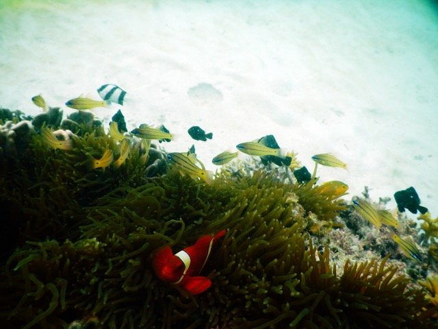 深潜很震撼,但说实话,此时此地,我还是更喜欢浮潜一些。摆脱了沉重潜水设备的束缚,我们可以四处游来游去,可以选择呆在海面上还是潜入水底,我们住的水上屋的下面就是一个很好的浮潜之地,只要有机会,我就带着水下相机在水下四处拍照。