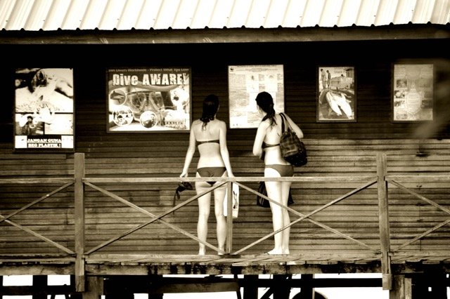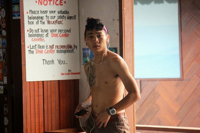 深潜比浮潜复杂得多,因此在深潜以前,我们得上半个小时的课。深潜教练是个温和爱笑的马来西亚年轻人,因为学员中还有几个马来西亚女人,他的汉语又不熟练,所以讲课是英语、马来语和汉语混杂着说,当他用我们听不懂的马来语与那些女人开玩笑的时候,那种咯咯的大笑简直能震翻屋顶,连我们这些比较严肃的中国人也被他们的欢乐感染了。