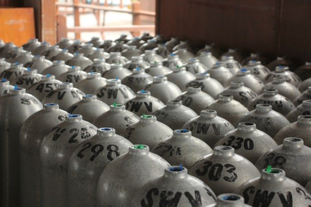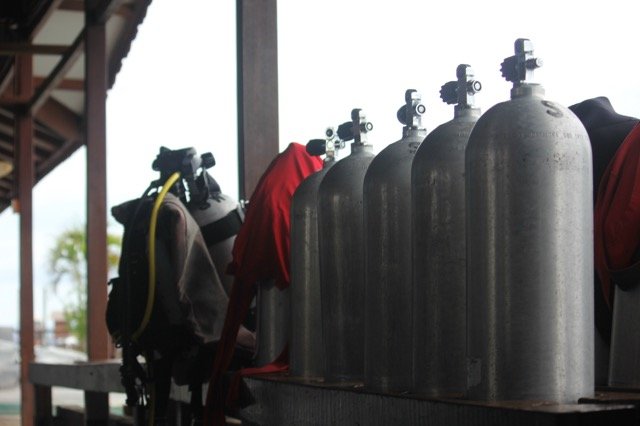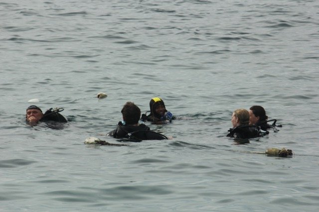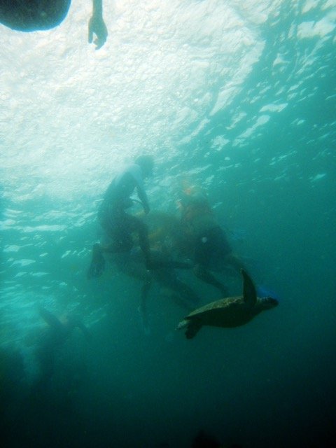 学习很有意思,不过,当我们真正背起氧气瓶,穿上潜水服,深入海底的时候,还是感到很紧张,这种体验确实与浮潜有着很大不同。没想到海底的声音的那么大,那么噪杂,头上的海浪声,同伴们此起彼伏地呼吸声让人觉得全世界的声音都冲我而来。而且左右都被幽幽的绿色海水包围,下面又是深不见底,着实给人带来一种恐惧感,让人不想再继续,只是想逃离。