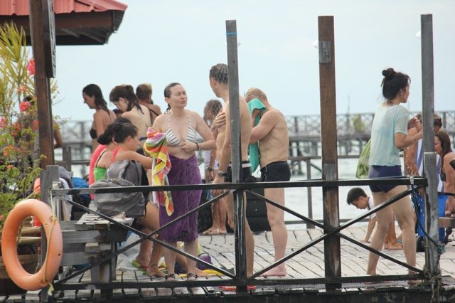 马布岛这个度假村最主要的娱乐活动就是潜水,有浮潜和深潜两种。浮潜是带着一根呼吸管在水上漂,透过浮潜镜欣赏水下的景色,深潜就复杂多了,要戴上氧气瓶什么的,不过可以下到比较深的地方。