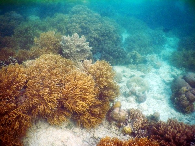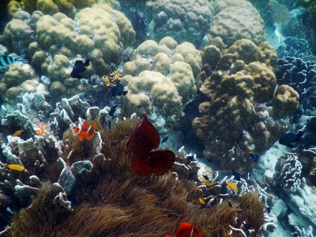 当然,潜水不仅仅是自由的乐趣,还有一大乐趣是观赏海里的奇妙景观。马布岛(还包括附近的诗巴丹岛和卡帕莱岛)一带真不愧为潜水胜地,在水下,珊瑚礁和各色的海葵就像树林一样环绕我们,还有色彩绚丽、多姿多彩,说不清名字的大鱼小鱼在这水底的丛林中穿梭,我们还看到了鲨鱼、海龟、寄居蟹、章鱼、海星、海胆……,阳光透过清澈的海水,照亮这一切,就像仙境一般,真是语言无法形容的美妙,这就是造物主的奇妙。