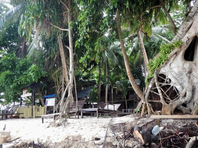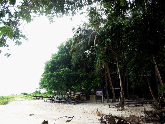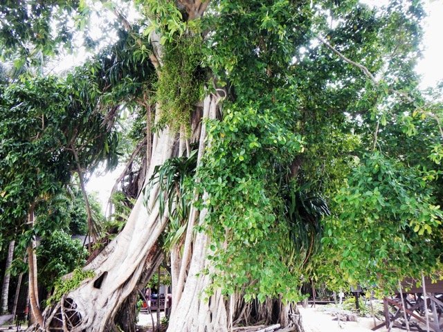 从岸边的简易木码头上岛,迎接我们的是一棵非常庞大的榕树(应该是吧),它的气根扎根在沙滩上,绿色的枝条四处伸展,就像一位保护天使,守卫着这个小小岛。在这棵大树后面,放着一个大木桌,两条长凳,度假村的服务员为我们搬来了一大箱点心,还有红茶和咖啡,我们脱下鞋,走在柔软的沙地上,坐下来边吃边喝,欣赏着这小岛的美景,人生的享受,也不过如此吧。就如圣经所说:人莫强如吃喝,且在劳碌中享福,我看这也是出于 神的手。(传道书2:24)此时我不禁要说阿们!