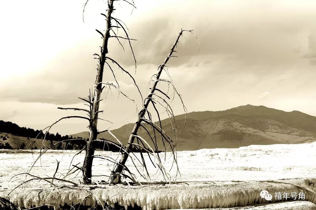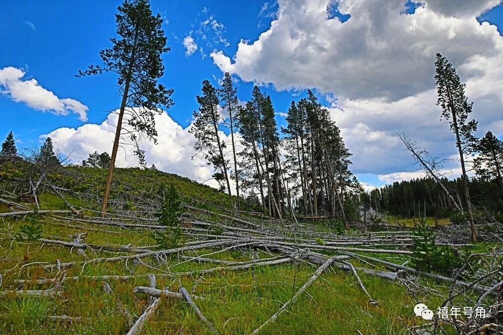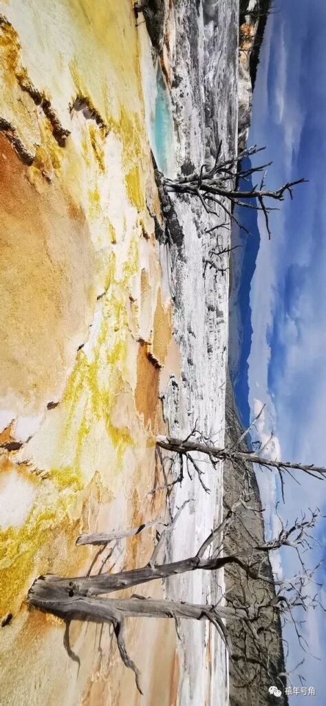 再往里面走,就是遍布的间歇泉、温泉、蒸气池、热水潭、泥地和喷气孔,其中的颜色更加醉人。石灰一样的白,浅水处的靛青,水潭深处的墨绿,矿物质凝结成的橙,在大地上划出一幅幅奇妙的五彩图案。可惜这样艳丽的场景往往是有毒的,水泉边常有许多死去的树干。所以不要被你的眼睛欺骗,好看的东西并不一定真的好,用心灵窥测方能得着事物的本质。