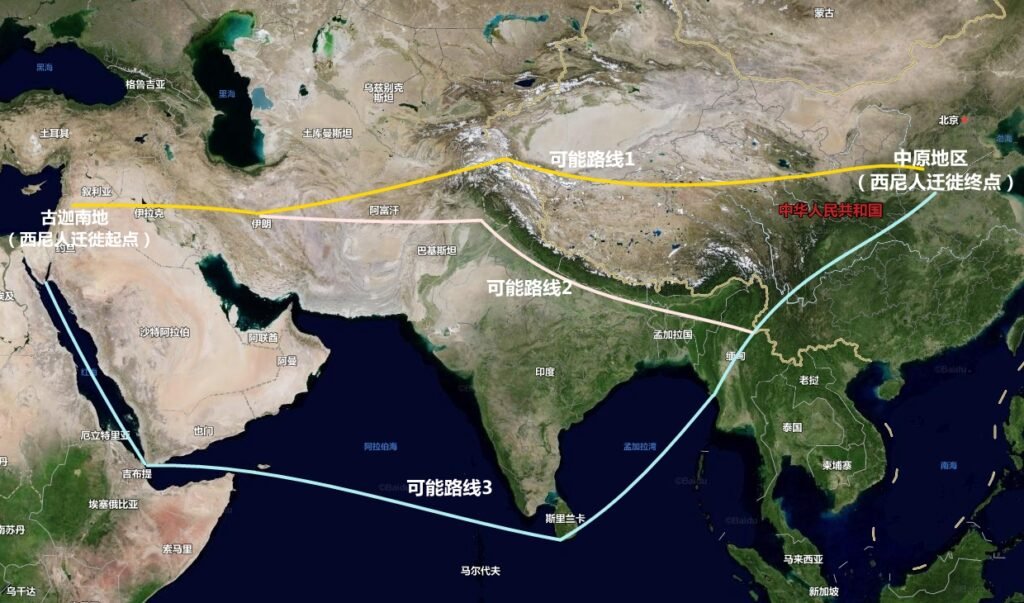 从路途的艰难程度看,西尼人迁移的路线很可能是上图的路线1,这条路线最短,路上的险阻也较少,而且这个过程也有可能持续几年或者几十年的时间。