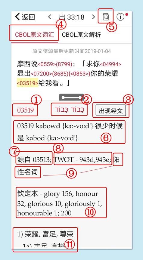③ 这个按钮很有用,点击就可以找到这个原文词在圣经的哪些章节出现。