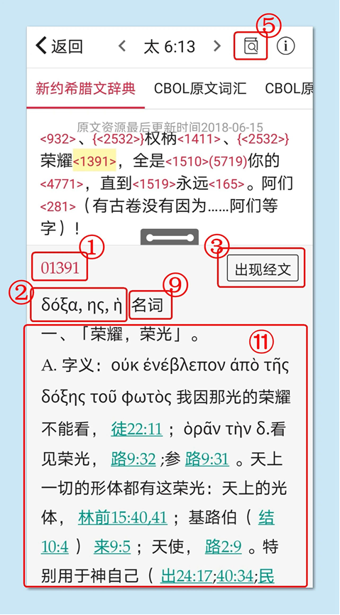 在学习这种方法之前,我们首先要弄懂查经时,APP页面上出现的东西是什么意思,通常,我们用“微读圣经”进行原文查经,会出现下面三个页面,页面上出现的东西,我们分别加了编号,后面进行解释(可以放大看):