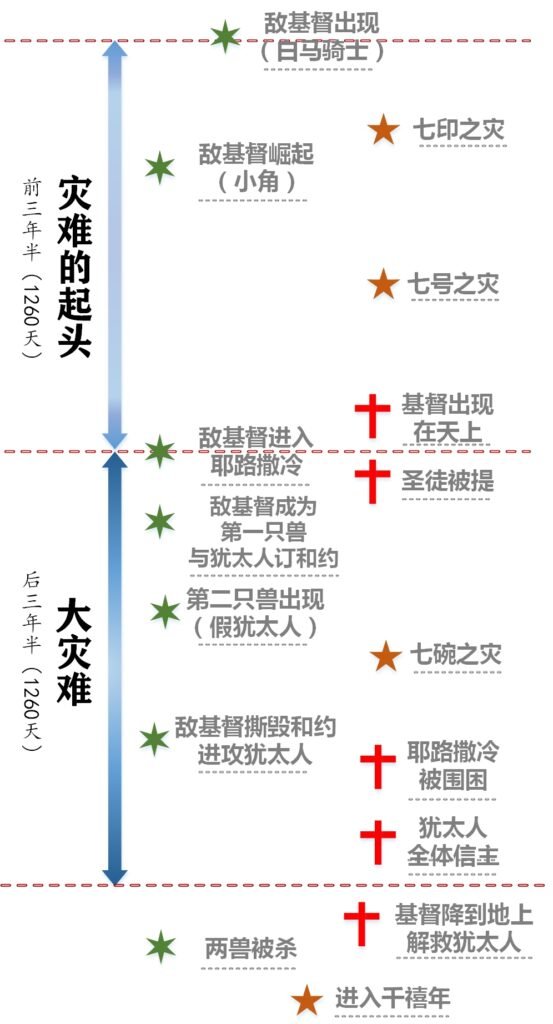 我们认为,末日七年要分成两个阶段,分为上下两个三年半,也就是1260天。上三年半,以敌基督的出现为标志,这个阶段是他施行诡计、攻城略地,逐渐壮大势力,以掌握世界统治权的阶段,给世界带来的灾难比较小,非拉铁非教会应该会经历前三年半的灾难,以考验他们的忠贞。后三年半则是敌基督彻底掌权的阶段,灾难比较大,在这些更大的灾难到来之前,耶稣基督就会回来,但不是地上而是空中,此时非拉铁非教会要与历世历代复活的圣徒,都要一起被提到空中与耶稣相会。