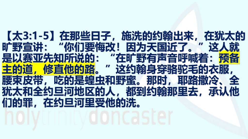 在那些日子,施洗的约翰出来,在犹太的旷野宣讲:“你们要悔改!因为天国近了。”这人就是以赛亚先知所说的: