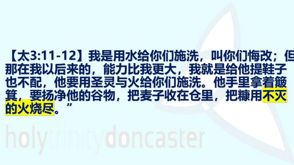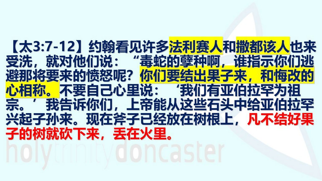 约翰看见许多法利赛人和撒都该人也来受洗,就对他们说:“毒蛇的孽种啊,谁指示你们逃避那将要来的愤怒呢?你们要结出果子来,和悔改的心相称。不要自己心里说:‘我们有亚伯拉罕为祖宗。’我告诉你们, 神能从这些石头中给亚伯拉罕兴起子孙来。现在斧子已经放在树根上,凡不结好果子的树就砍下来,丢在火里。我是用水给你们施洗,叫你们悔改;但那在我以后来的,能力比我更大,我就是给他提鞋子也不配,他要用圣灵与火给你们施洗。他手里拿着簸箕,要扬净他的谷物,把麦子收在仓里,把糠用不灭的火烧尽。”
