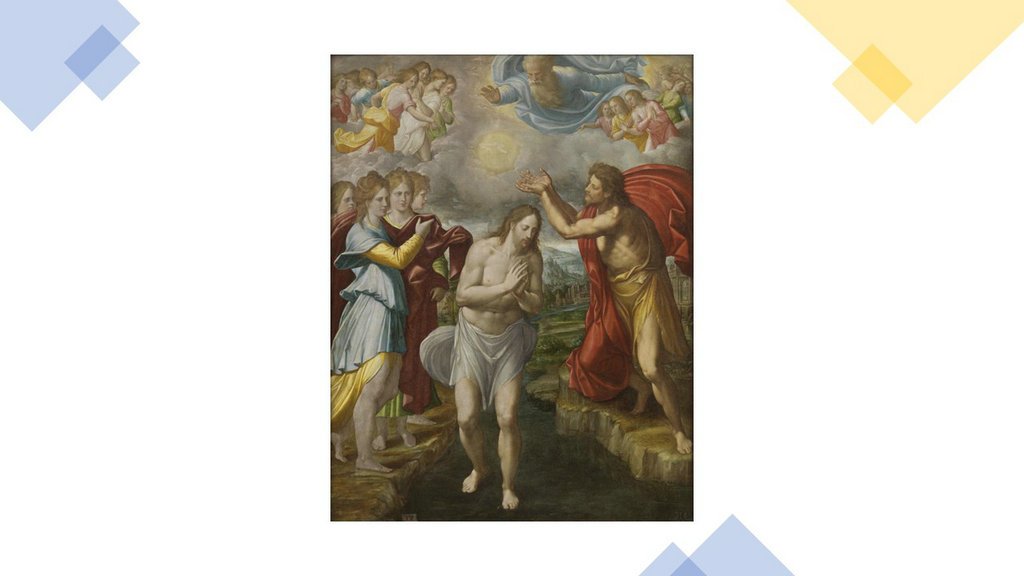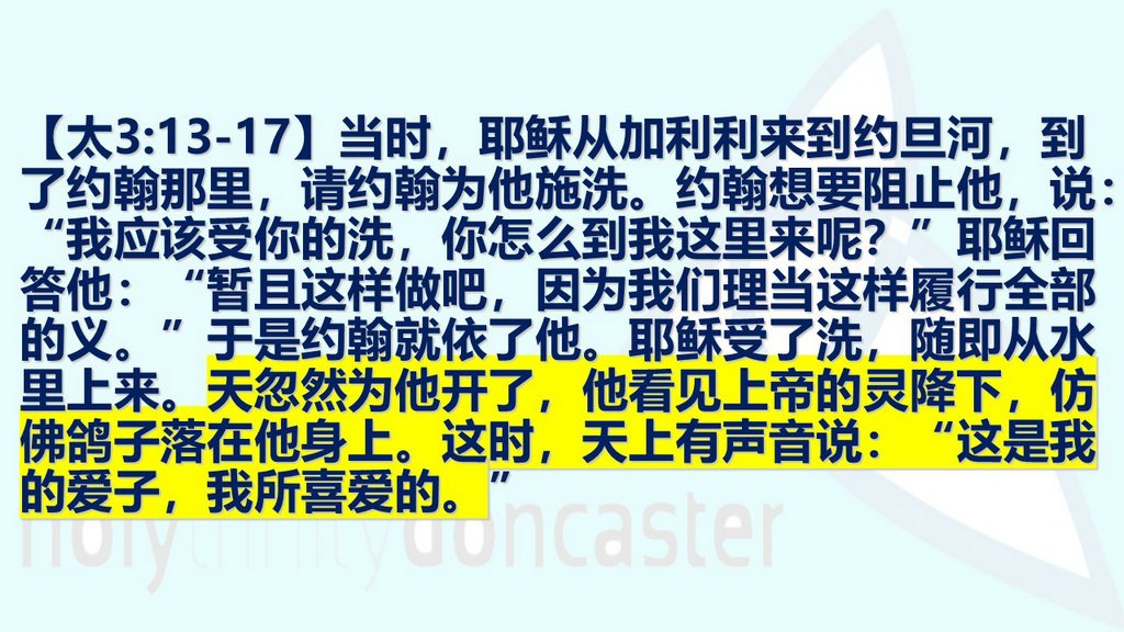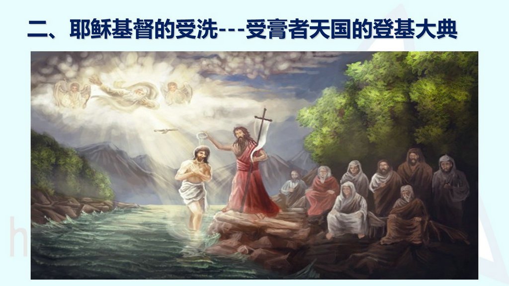 当时,耶稣从加利利来到约旦河,到了约翰那里,请约翰为他施洗。约翰想要阻止他,说:“我应该受你的洗,你怎么到我这里来呢?”耶稣回答他:“暂且这样做吧,因为我们理当这样履行全部的义 。”于是约翰就依了他。耶稣受了洗,随即从水里上来。天忽然为他 开了,他看见 神的灵降下,仿佛鸽子落在他身上。这时,天上有声音说:“这是我的爱子,我所喜爱的。”