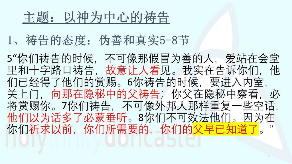 “你们祷告的时候,不可像那假冒为善的人,爱站在会堂里和十字路口祷告,故意让人看见。我实在告诉你们,他们已经得了他们的赏赐。你祷告的时候,要进入内室,关上门,向那在隐秘中的父祷告;你父在隐秘中察看,必将赏赐你。你们祷告,不可像外邦人那样重复一些空话,他们以为话多了必蒙垂听。你们不可效法他们。因为在你们祈求以前,你们所需要的,你们的父早已知道了。”