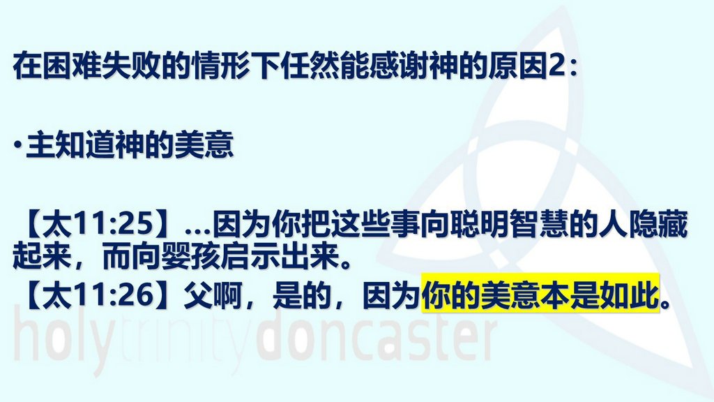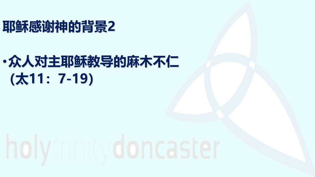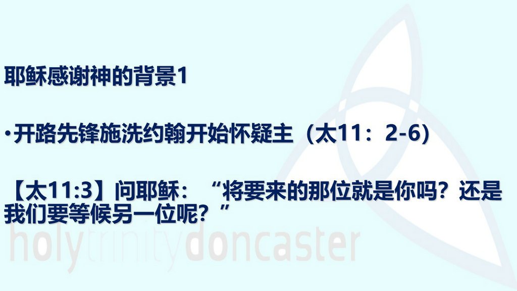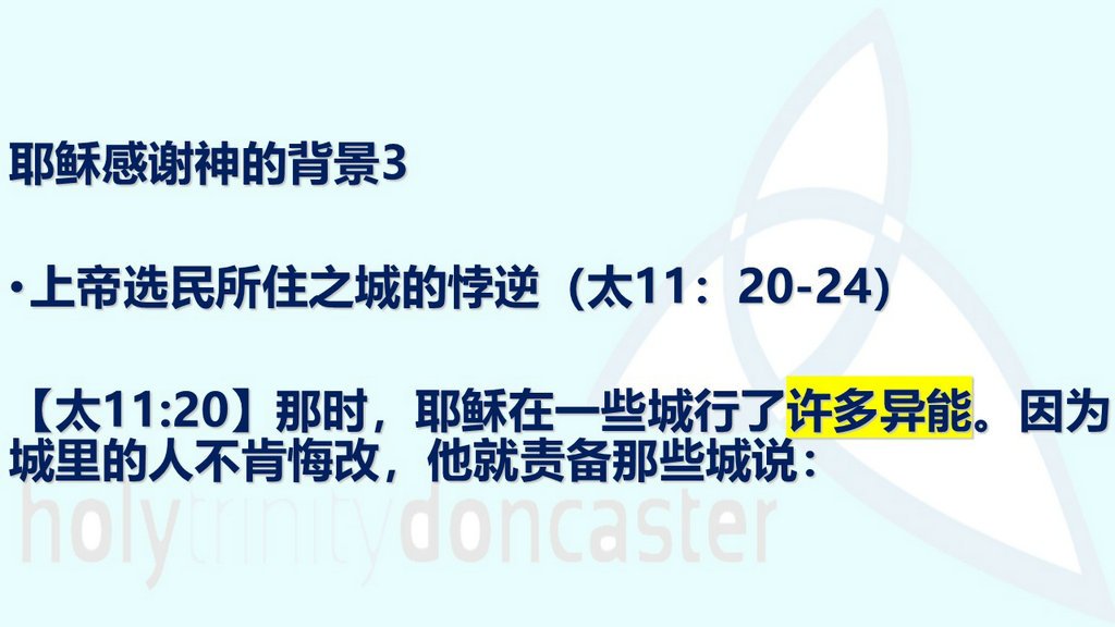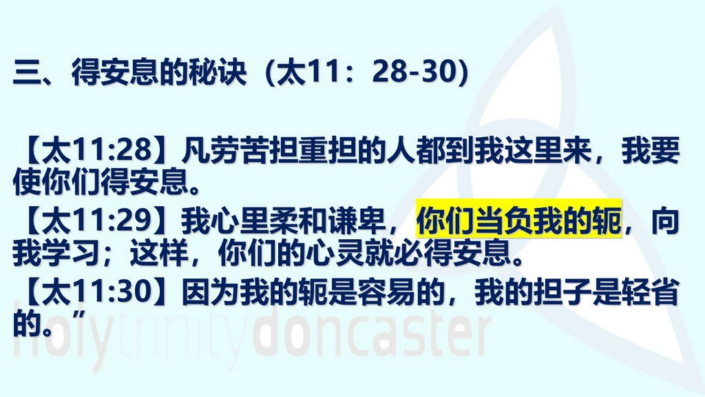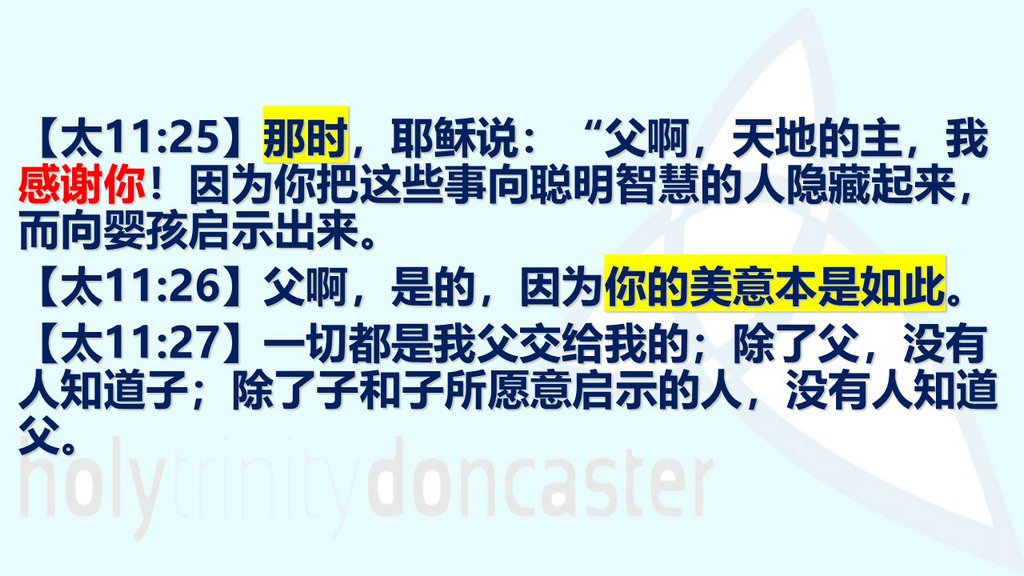 那时,耶稣说:“父啊,天地的主,我感谢你!因为你把这些事向聪明智慧的人隐藏起来,而向婴孩启示出来。父啊,是的,因为你的美意本是如此。一切都是我父交给我的;除了父,没有人知道子;除了子和子所愿意启示的人,没有人知道父。凡劳苦担重担的人都到我这里来,我要使你们得安息。我心里柔和谦卑,你们当负我的轭,向我学习;这样,你们的心灵就必得安息。因为我的轭是容易的,我的担子是轻省的。”